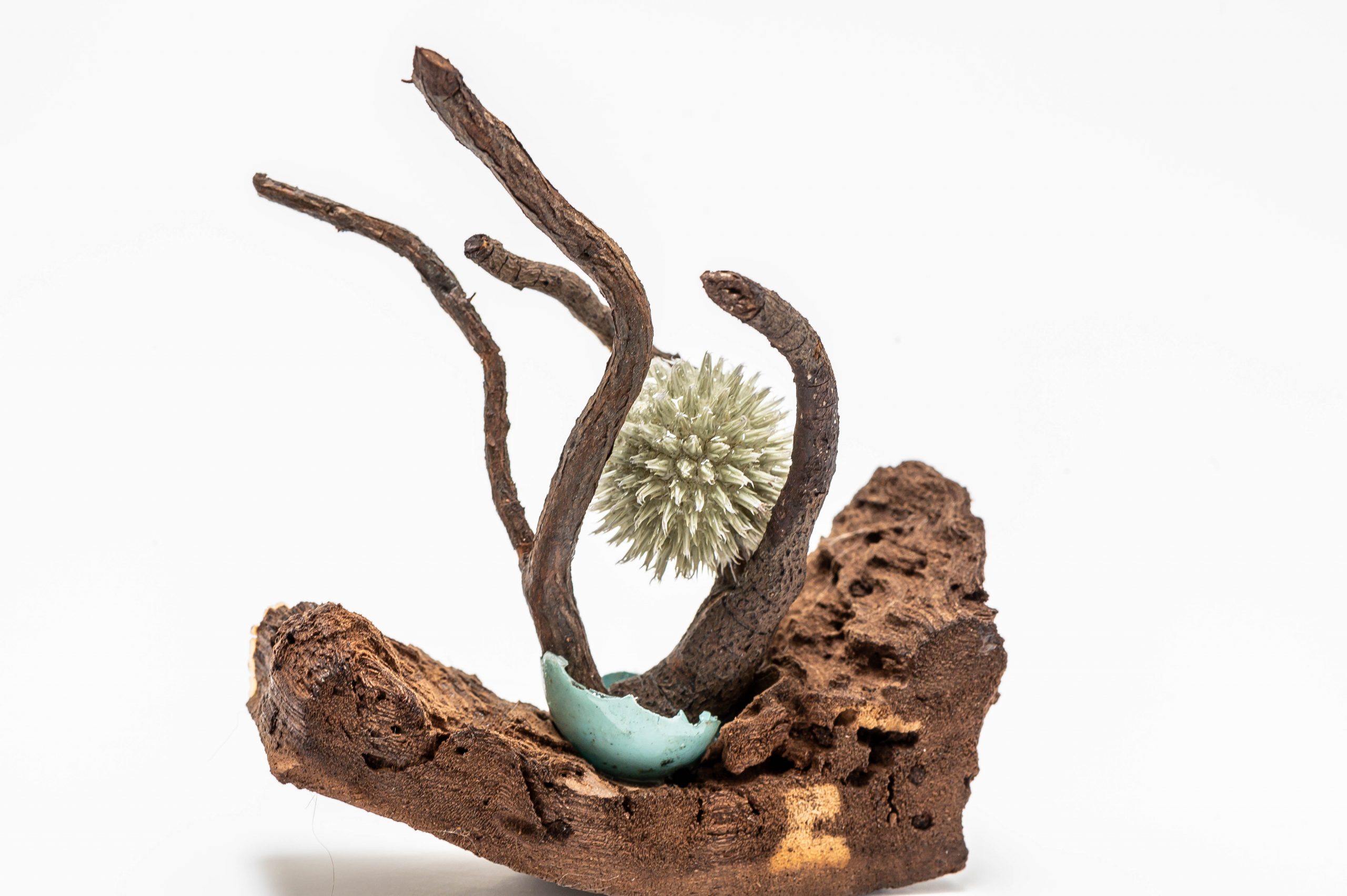 L’artiste plasticienne propose également plusieurs sculptures des séries «Dames nature» et «Prendre racine». Ces petits bouts de femme et quelques messieurs fabriqués à partir d’ossements, de racines et d’autres matériaux naturels prennent la pose fièrement. Ils imposent aux visiteurs un moment d’arrêt et de réflexion sur l’infinie richesse que la nature a à offrir, mentionne l’artiste.