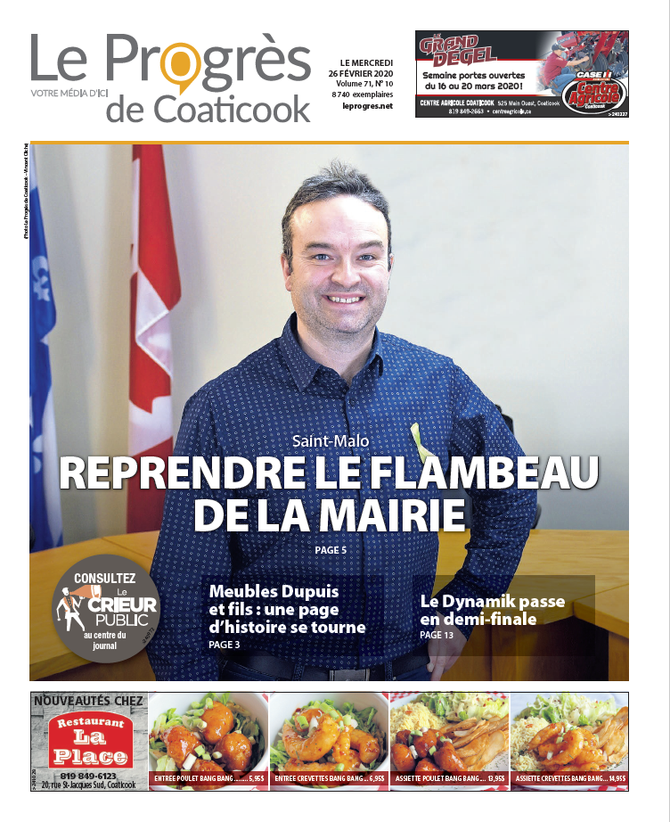 WEB. En exclusivité pour les lecteurs du www.leprogres.net, voici la Une du Progrès de Coaticook du 26 février 2020… avant tout le monde.